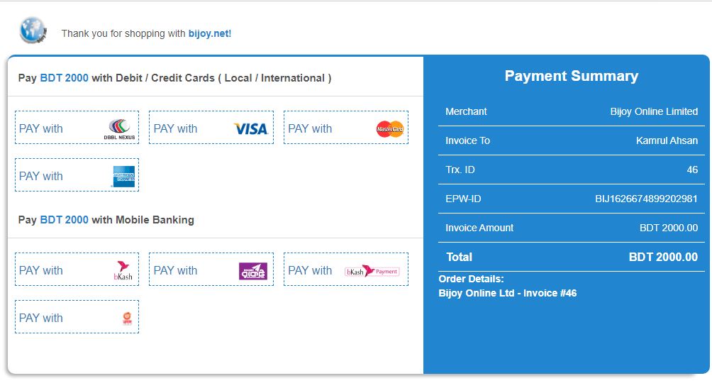 Payment Gateway page will appear and here is several option for payment. Please choose your payment method (bKash, Rocket, Nagad etc.)