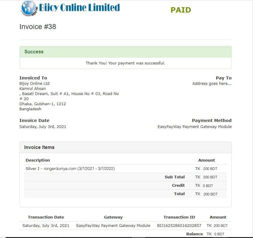 After successfully completion of your payment, you will get an invoice for your product. See below screen